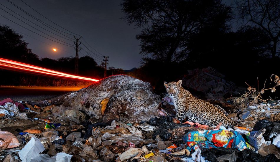 Rajat Chordia capturó una imagen impactante en Udaipur, India. Mostró a un leopardo alimentándose del cadáver de una vaca junto a una carretera concurrida en medio de la basura. Esta escena destacó los desafíos que enfrenta la población de leopardos de la ciudad debido a la pérdida de hábitat. Los esfuerzos de conservación son más importantes que nunca.